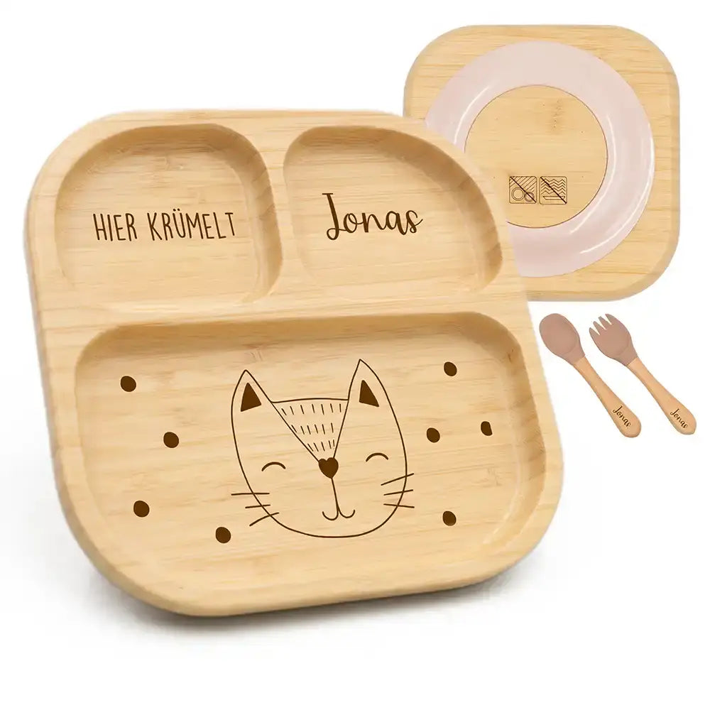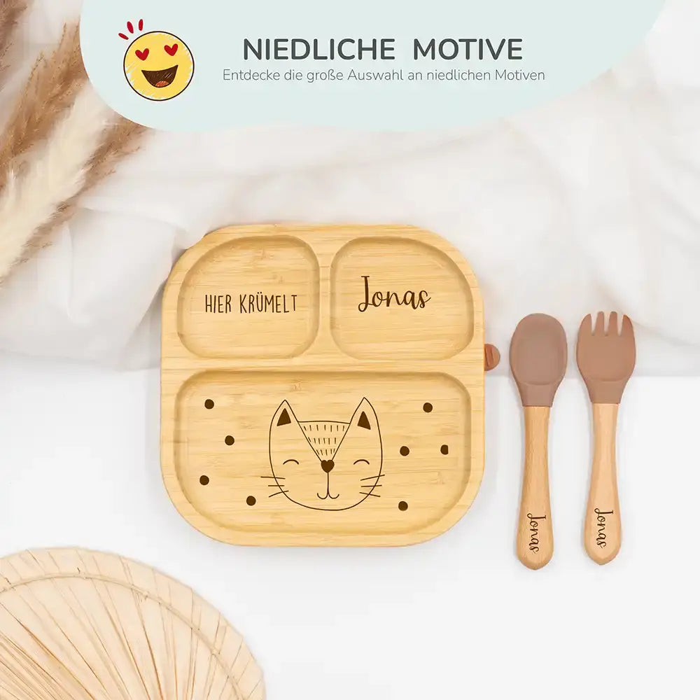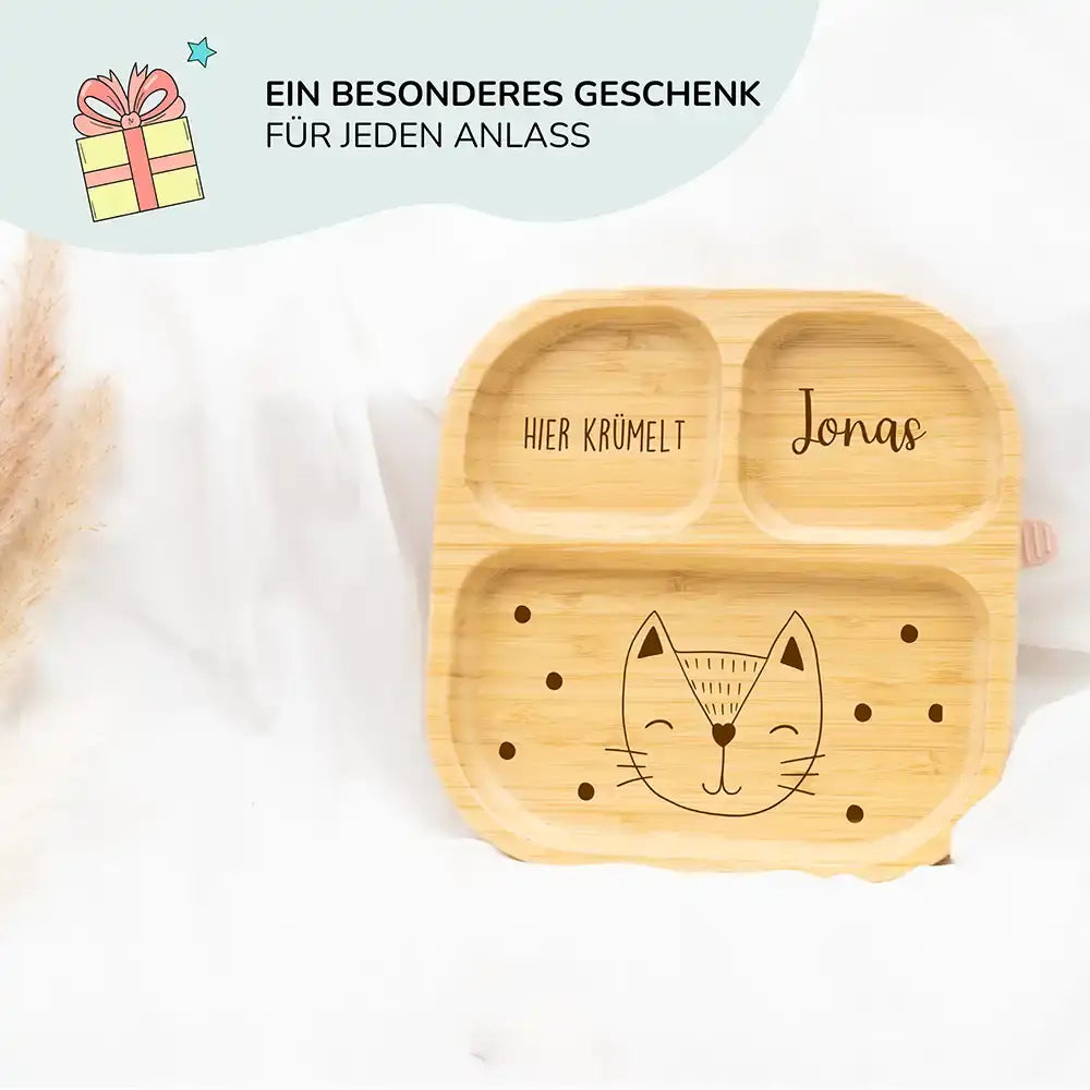 Die drei praktischen Fächer mit niedlicher Gravur "HIER KRÜMELT" und dem persönlichen Namen deines Lieblings machen Essen zum Kinderspiel. Das süße Tiermotiv zaubert ein Lächeln auf jedes Kindergesicht!