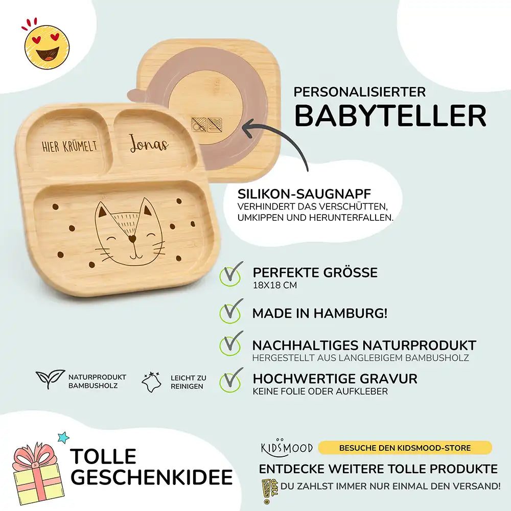 Schluss mit Chaos am Esstisch! Unser personalisierter Kinderteller aus Bambus mit rutschfestem Saugnapf verwandelt jede Mahlzeit in ein fröhliches Abenteuer.